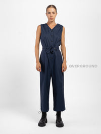 Salopette smanicata con bottoni davanti e cintura, gambule largo e tasche laterali